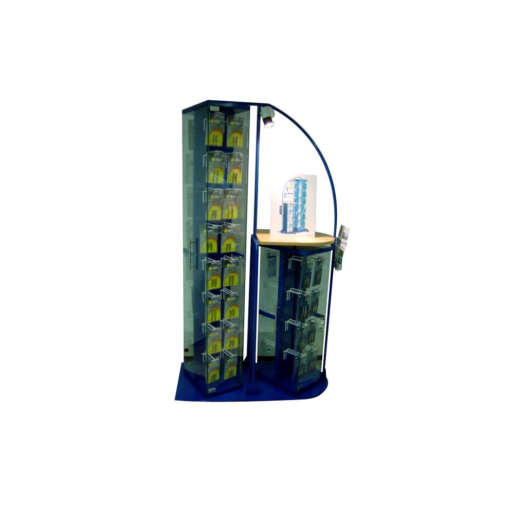 - Les vitrines tournantes en forme de colonne, valorisent les produits, facilitent le classement et augmentent la capacité de stockage.